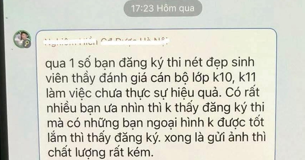 Ngày 16.4, mạng xã hội lan truyền đoạn tin nhắn được cho là của một giảng viên Trường CĐ Dược Hà Nội, liên quan đến cuộc thi nét đẹp sinh viên của trường. Nội dung tin nhắn gây tranh cãi khi nhiều ý kiến cho rằng đã miệt thị ngoại hình sinh viên.